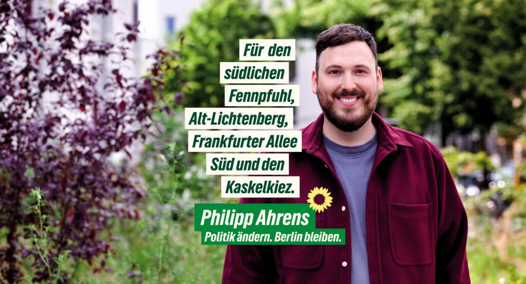 ich bin dein Direktkandidat für den Wahlkreis 4 in Berlin-Lichtenberg bei der Wahl zum Berliner Abgeordnetenhaus am 20. September 2026. Mit deiner Stimme darf ich für die Menschen im südlichen Fennpfuhl, in Alt-Lichtenberg, in der Frankfurter Allee Süd und im Kaskelkiez in das Berliner Abgeordnetenhaus. Ich schütze das Klima und Mieter:innen und sorge dafür, dass Busse und Bahnen zuverlässig fahren.